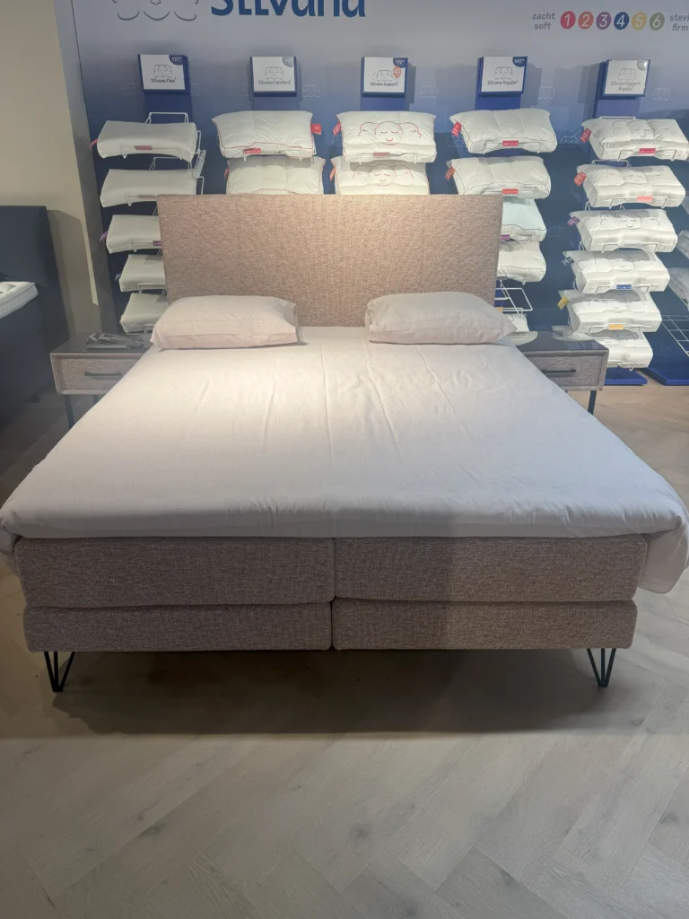 Grijp je kans met deze luxe Eastborn Stud boxspring – nu flink afgeprijsd als showroommodel! Geniet van ultiem comfort, stijlvolle afwerking en hoogwaardige materialen voor een onverslaanbare prijs.